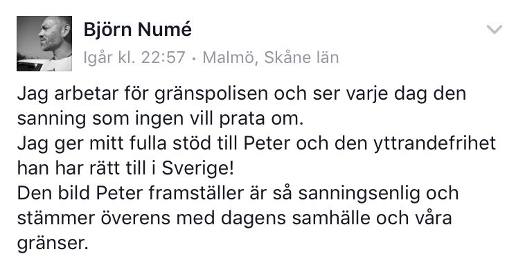 12. Jag håller med den ansvarstagande polisen Peter Springare. Det finns förmodligen ingen polis, som tycker annorlunda? För att komma till rätta med allt som de öppna gränserna orsakat, bör man stänga ned all form av invandring från MENA-länderna tills man rett ut alla grumliga beslut från migrationsverket. När Migv. undanlåtit all form av säkerhet ( epidemisk smitta, id-kontroller, registrering med dna och fingeravtryck, orsak till asyl enligt människorätten ) eller aldrig fått direktiv för att det skall följas, har Sverige verkat bli en uppsamlingsplats för internationella förbrytare av alla former, som skall matas med bidrag och personlig service. Man skall kunna ta ifrån notoriska förbrytare sina Svenska medborgarskap och utvisa alla som begår brott i sitt nya land. När man fått slut på alla no go zoner och stenkastande ungdomar med obegränsat samhällshat, kan man öppna för en ny ordnad biståndspolitik, som hjälper samhället likaväl som människor. Det vi har nu verkar vansinnigt oansvarigt och kan väl anses brottsligt mot nationens invånare. Varför inte utfärda inresetillstånd från de med pass från de muslimska länder, som sedan flera år har inresetillstånd mot alla med Israeliskt pass. Som en solidaritetsyttring mot rasdiskriminering?