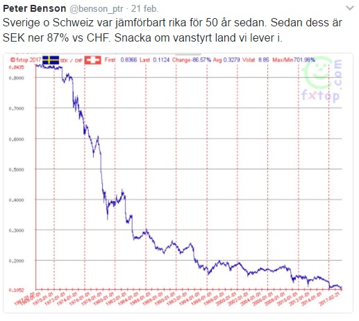 Sverige och Schweiz var jämförbart rika för 50 år sedan (Perioden 1967 – 2017). Sedan dess är SEK ner 87% vs CHF. Snacka om vanstyrt land vi lever i. Exempel på konsekvenserna av Socialdemokratisk vanskötsel av Sverige