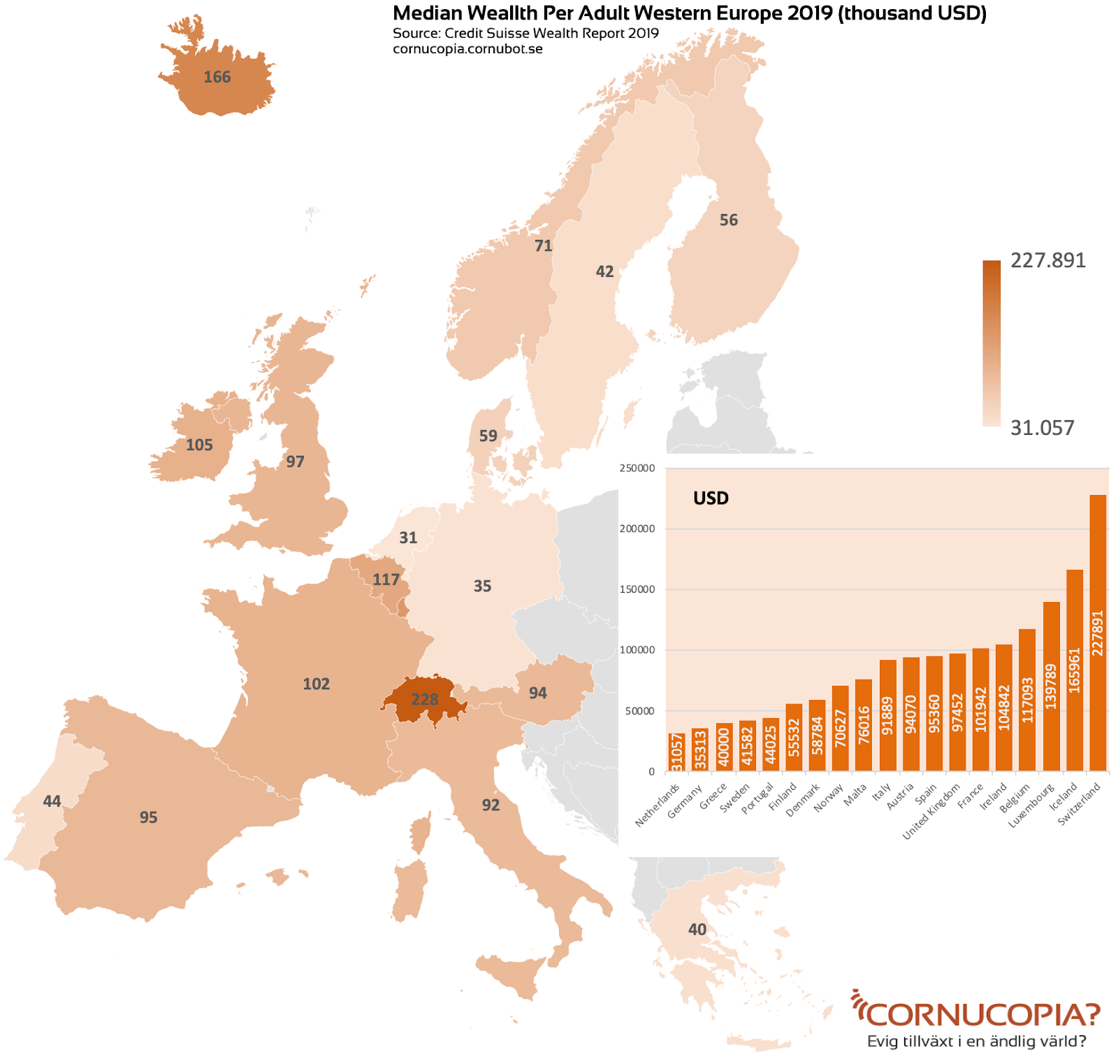 Sveriges välfärdsekonomi för helåret 2019 jämfört med övriga länder i Europa, vilket också har stor betydelse i sammanhanget: