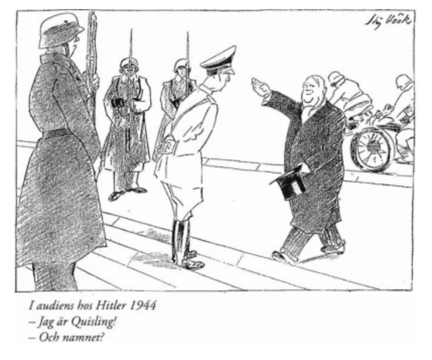 1944 publicerade Göteborgs Handels och Sjöfartstidning en skämtteckning av Ragnvald Blix och som skildrar när den norske landsförrädaren Vidkun Quisling är på besök hos Hitler i Berlin. Utanför rikskansliet gör han en nazisthälsning, och säger samtidigt: ”Jag är Quisling” Varpå adjutanten undrande frågar: ”Och namnet?”